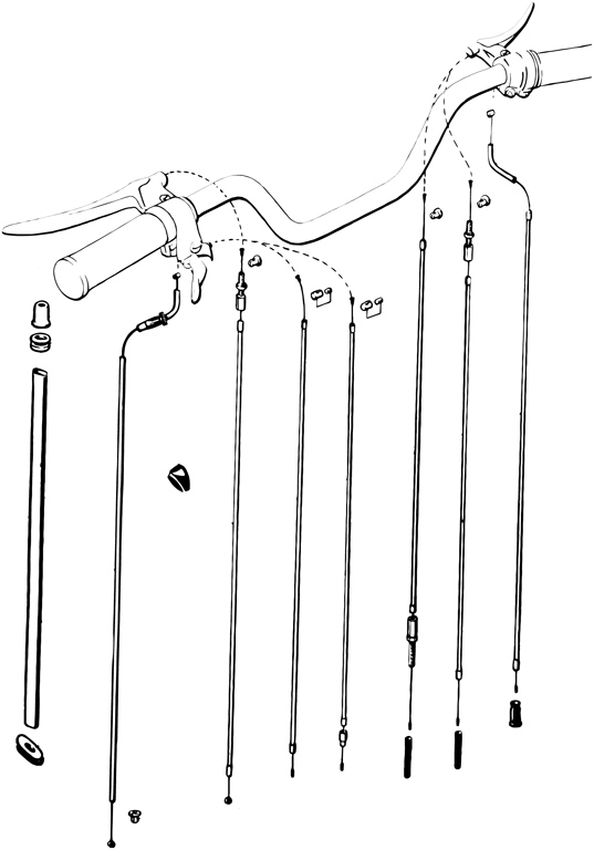 der Bowdenzugsatz enthält: je 1 x Gaszug, Dekompressionszug, Handbremszug, Schaltzug 2-Gang, Kupplungszug
